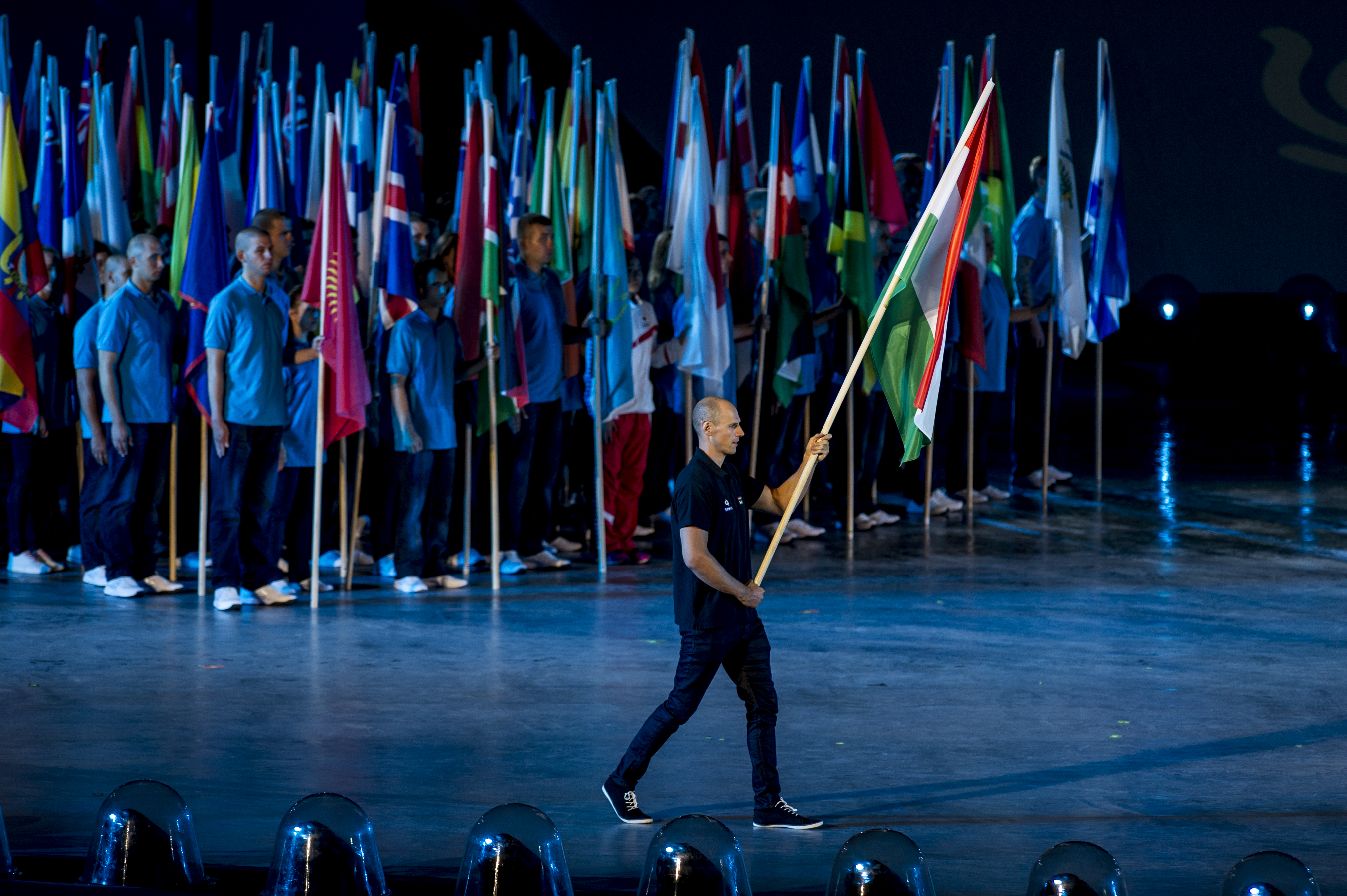 Next came an introduction to the Budapest World Aquatics Championships’ venues, followed by a procession of flags from the participating countries, ending with the flag of Hungary, which was taken onto the stage by Olympic and world champion water polo player Dénes Varga.