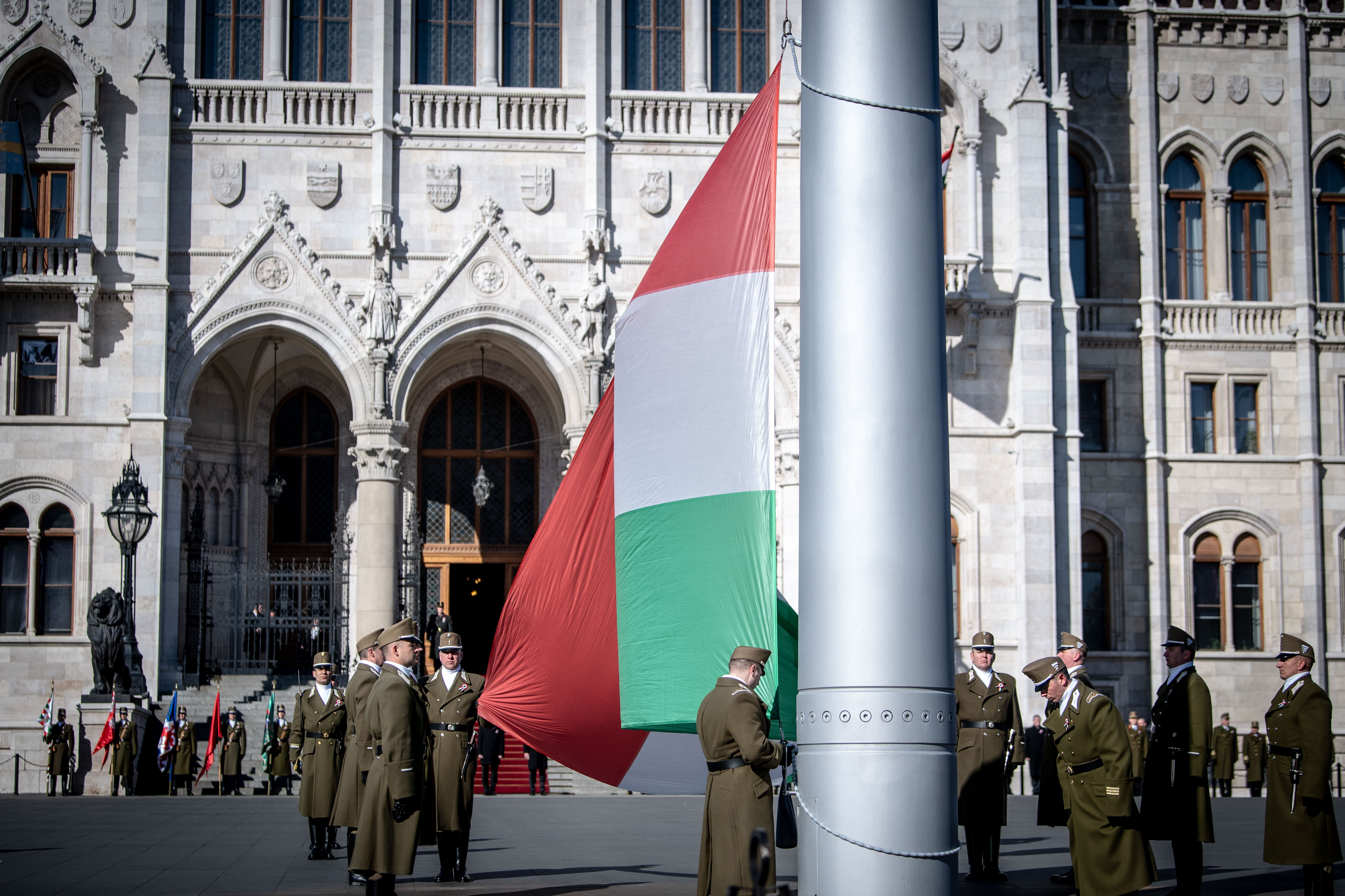 Katonai tiszteletadás mellett felvonták a nemzeti lobogót a Parlament előtt a március 15-ei nemzeti ünnepen, vasárnap.
