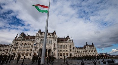 Katonai tiszteletadás mellett felvonták a nemzeti lobogót az Országház előtt a március 15-ei nemzeti ünnepen.